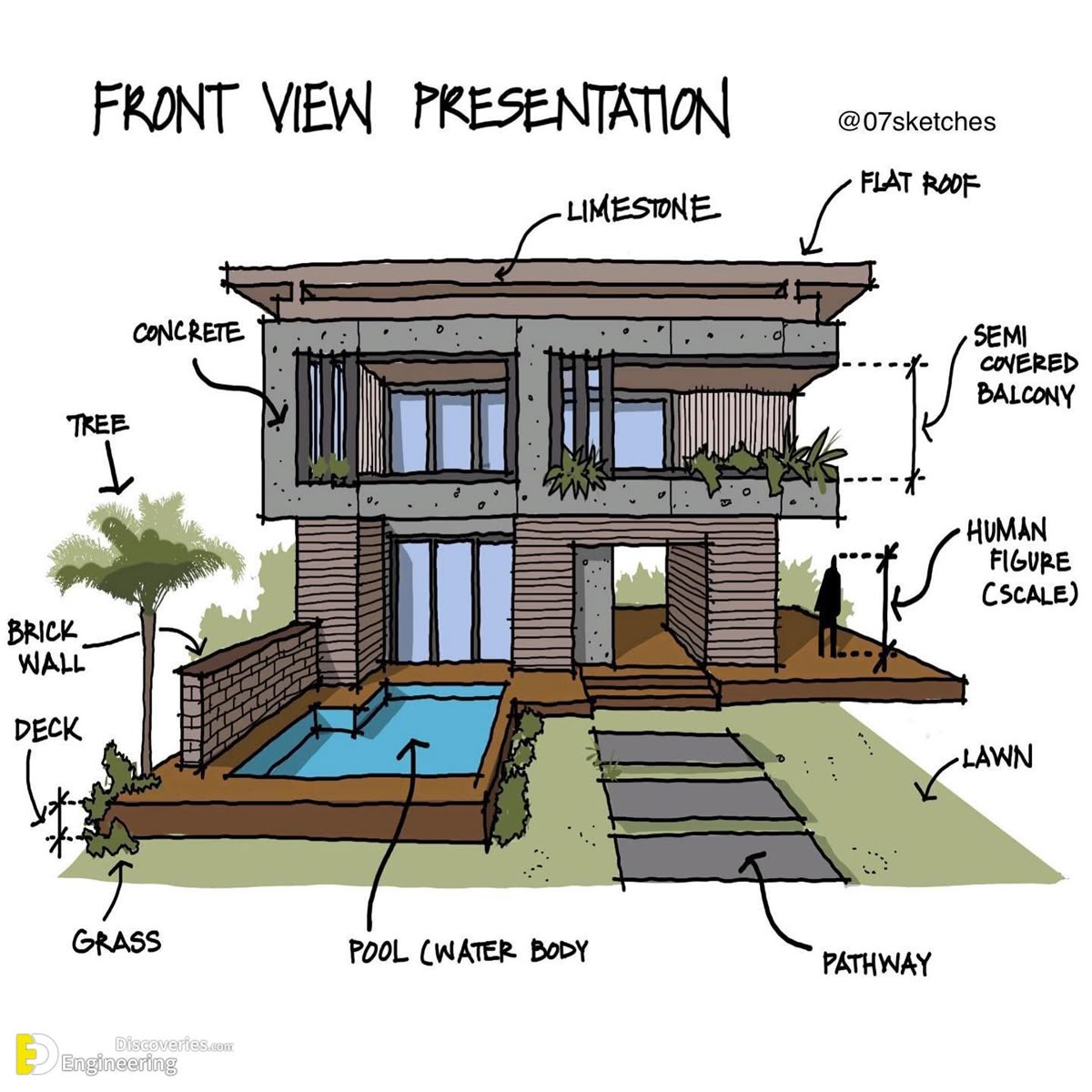 Another essential feature in the presentation is the human figure included in the drawing. While it may seem minor, this simple addition is critical for architectural communication. By showing a person next to the structure, viewers can immediately understand the scale and proportions of the building. It helps translate abstract lines and shapes into a relatable, real-world experience.