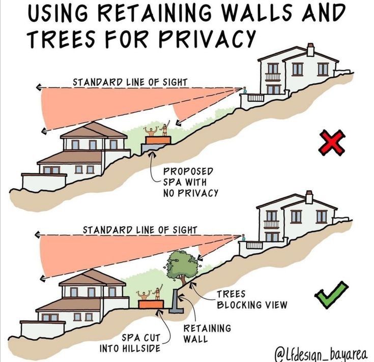 The second example (marked with a green βοΈ) demonstrates the solution: cutting the spa into the hillside and using retaining walls with trees to block sightlines.