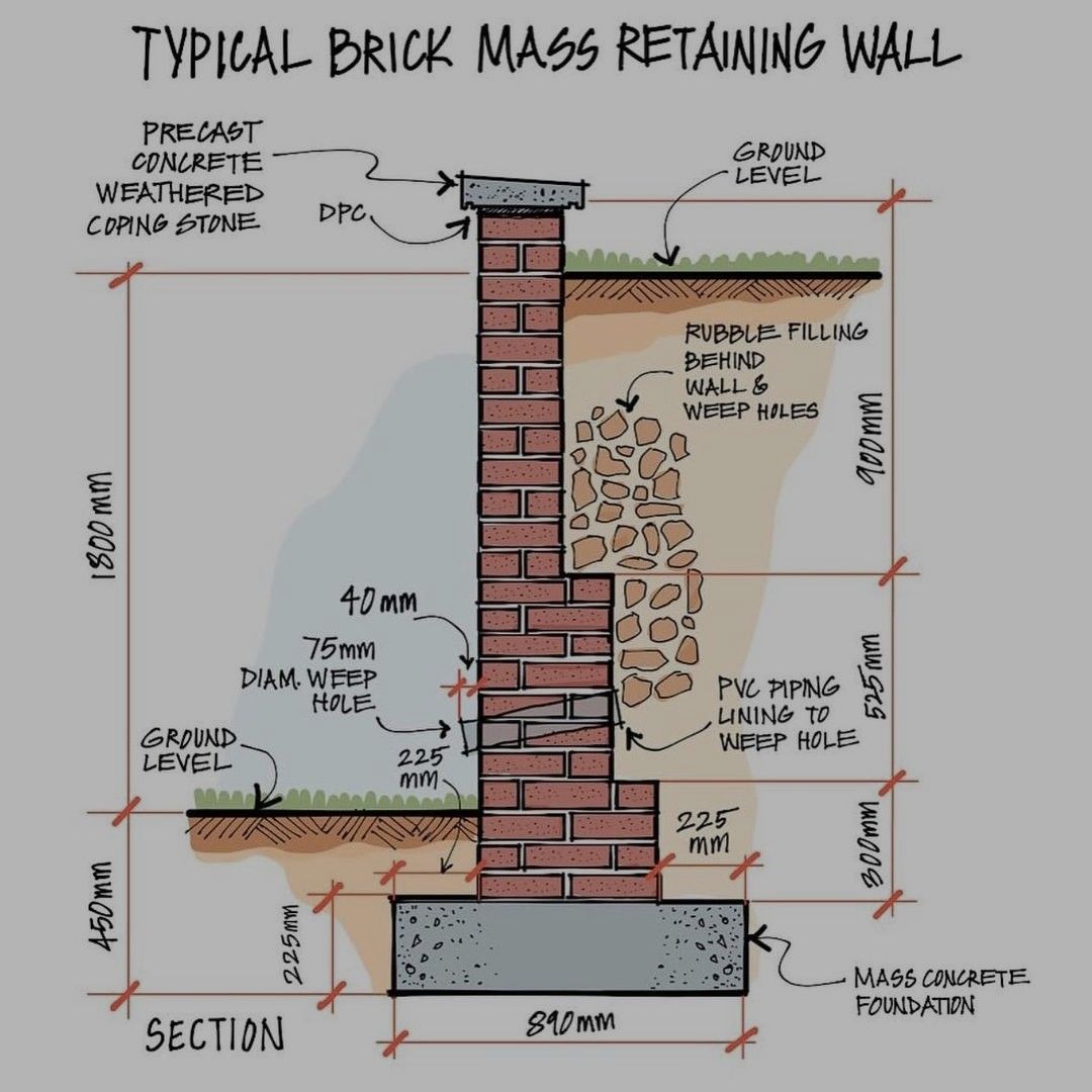 This drawing shows a standard 1.8 m high brick retaining wall with a wide concrete foundation, rubble backfilling, and drainage holes. Itβs strong, simple to build, and ideal for gardens, small plots, or boundary-level retaining structures.