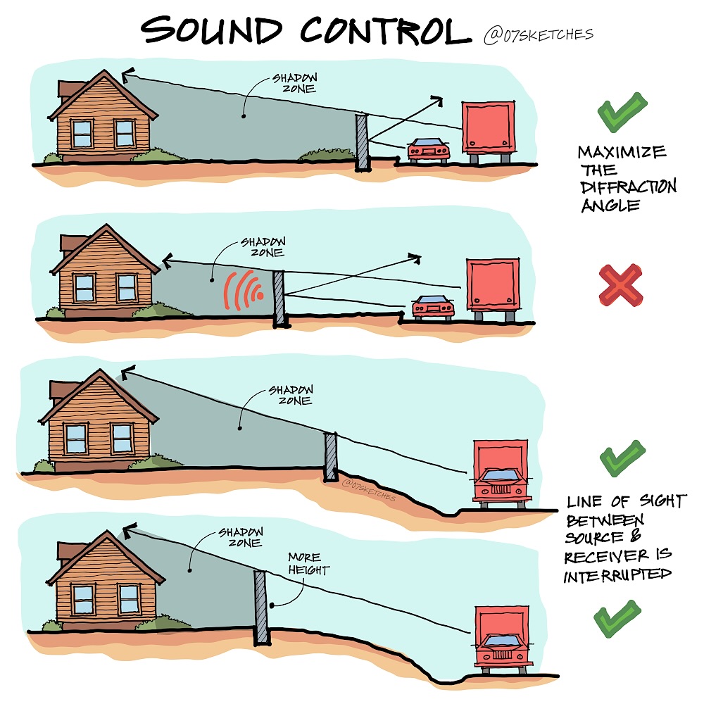 Before breaking ground, it’s crucial to grasp how sound travels around obstacles. When a noise source (like a passing truck) meets a barrier, two phenomena occur: