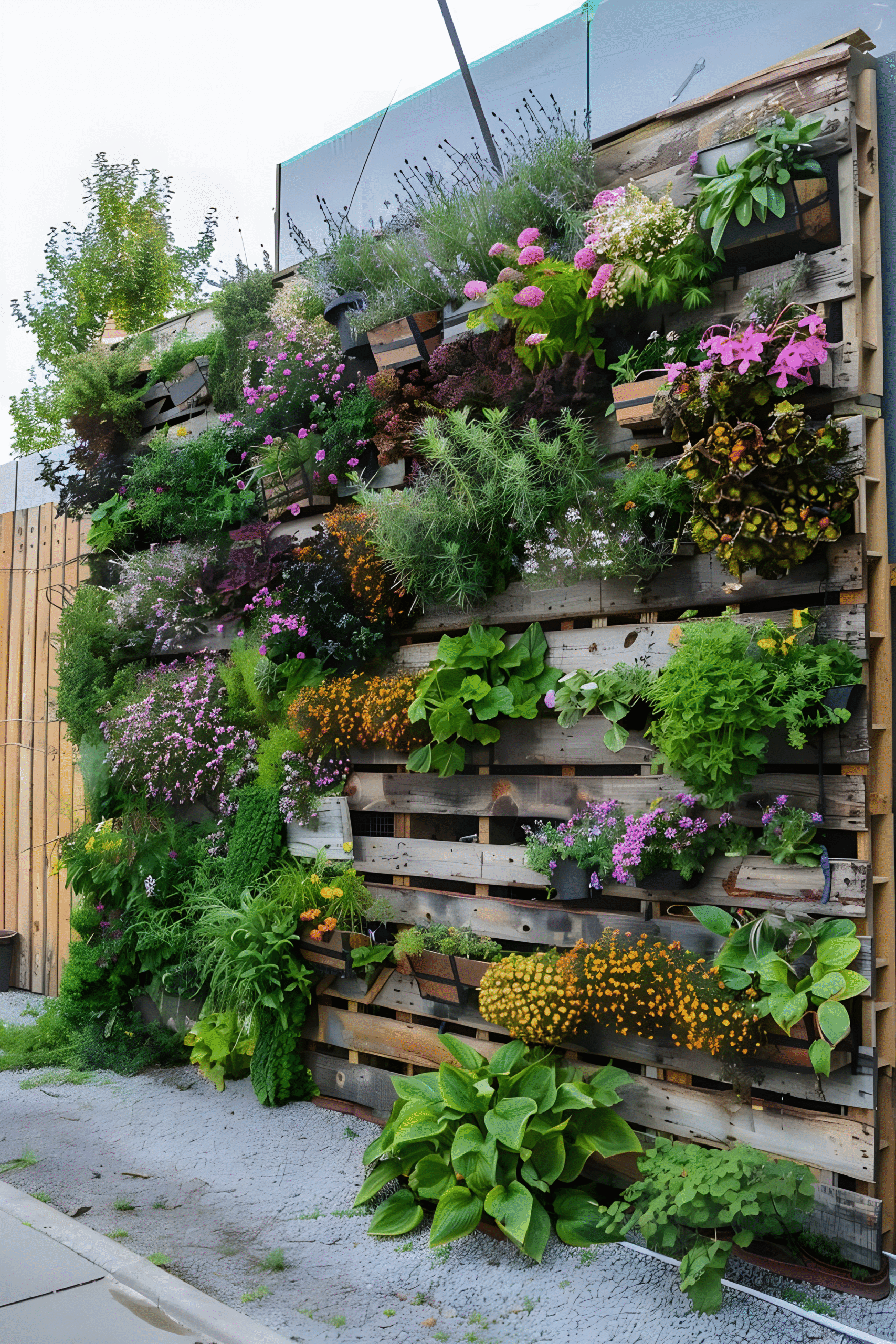The structure’s design cleverly merges rustic charm with eco-modernism. The pallets, weathered and repurposed, retain their industrial past while cradling flourishing life. Metal planters and natural fibers add contrast and texture, while climbing vines soften the lines and create a fluid connection between the built and natural worlds.