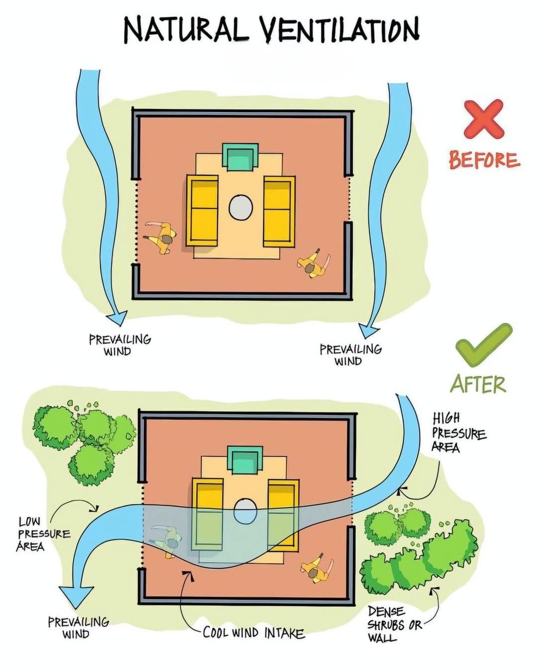 The improved design integrates natural ventilation principles, showing how small changes can make a huge difference: