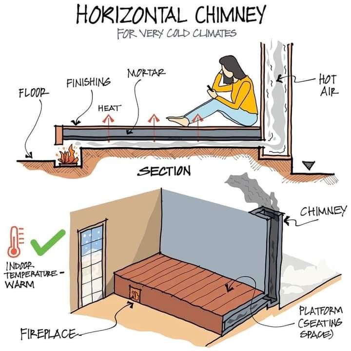This traditional heating method, once common in high-altitude and northern regions, uses the natural movement of heat and hot air from a fireplace to warm floors and seating platforms. Affordable, sustainable, and remarkably effective, the horizontal chimney system could become an essential design feature for homes in the face of rising energy prices and growing environmental concerns.