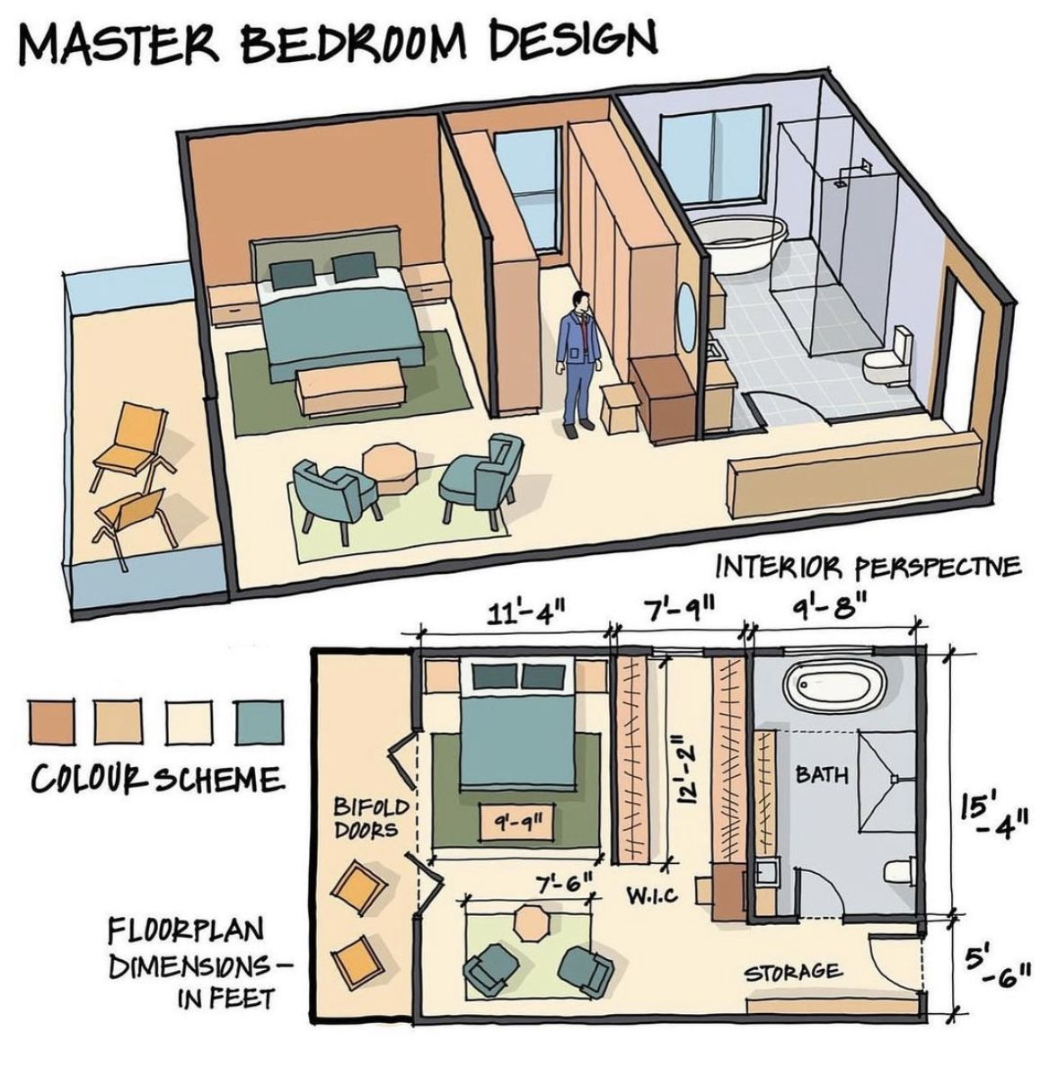The master bedroom is more than just a place to sleepβ€”it’s a sanctuary, a private escape where design must combine comfort, beauty, and function. The layout in this design demonstrates how smart space planning, soothing colors, and practical features can transform a bedroom into a haven.