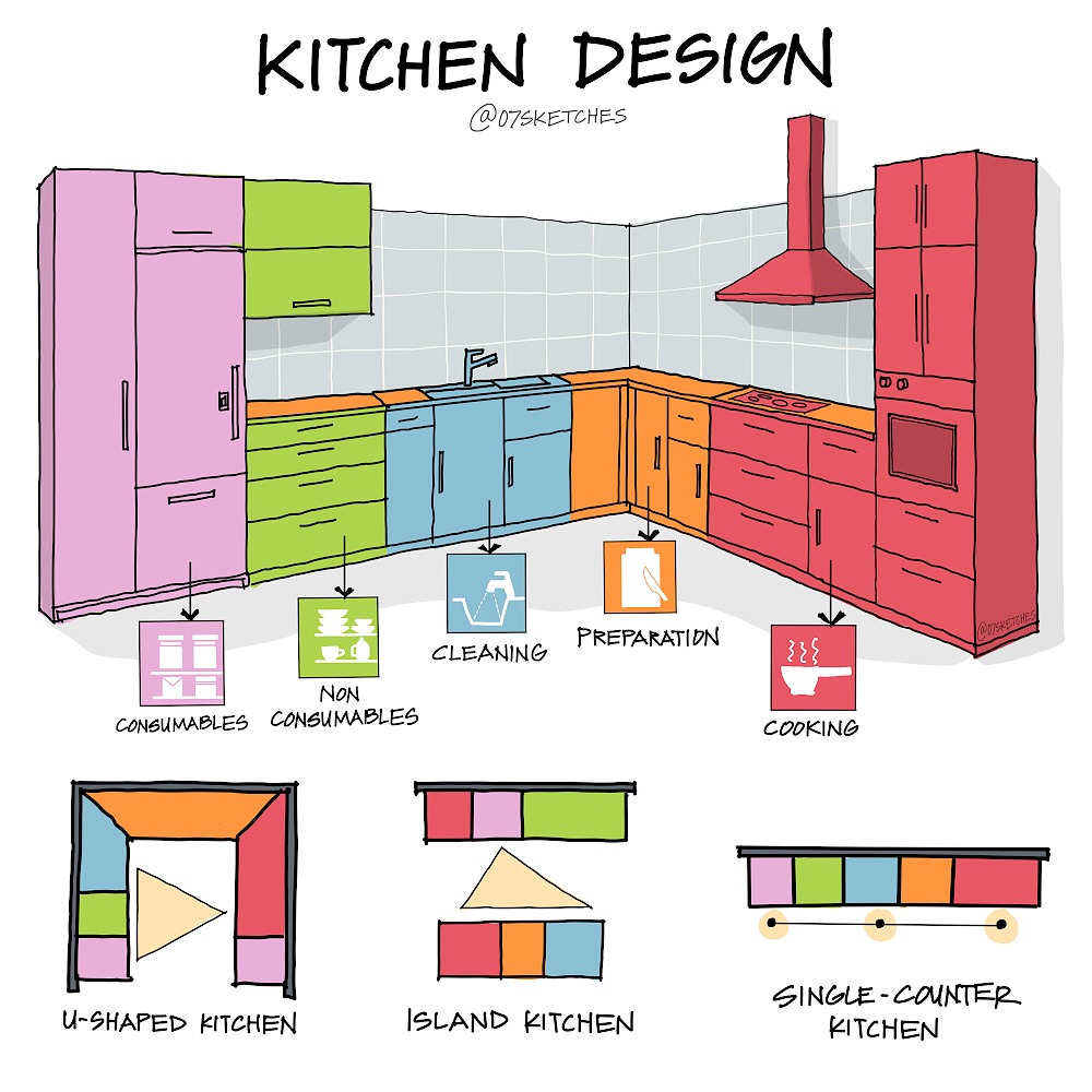 - Countertops in this zone should be spacious and well-lit, with storage directly underneath.