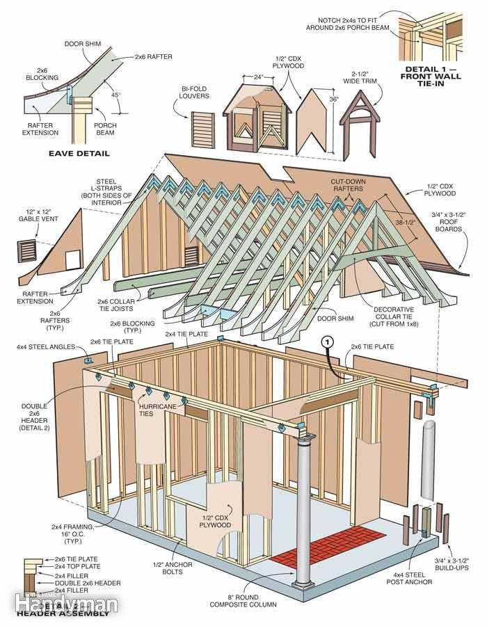 • Heavy-Duty Framing: Throughout the plan, there is an emphasis on strength. A Double 2×6 Header, as shown in the header assembly detail, provides immense support over the wide front opening, ensuring the weight of the roof doesn’t cause sagging.