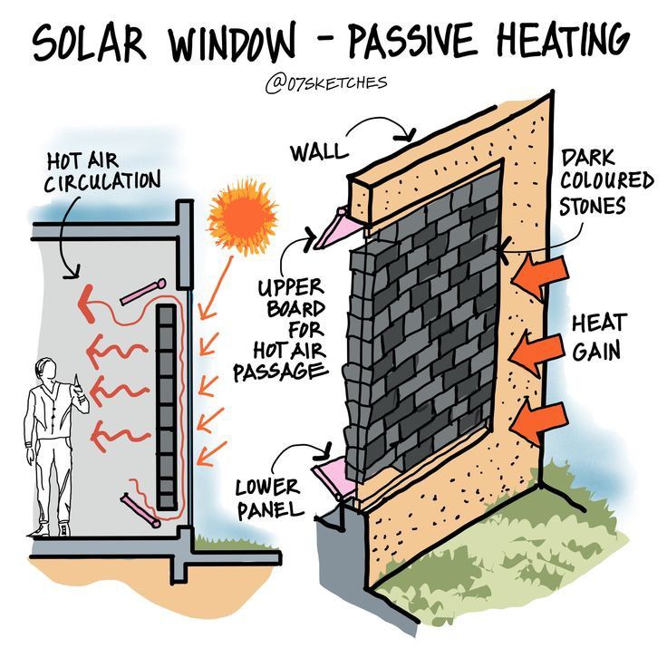 The system is essentially a glass-fronted air collector built onto the exterior of a sun-facing wall (south-facing in the Northern Hemisphere). Sunlight passes through the glass and strikes a wall of dark-colored stones. The dark, heavy material acts as a thermal mass, absorbing a massive amount of solar energy and converting it into heat.
