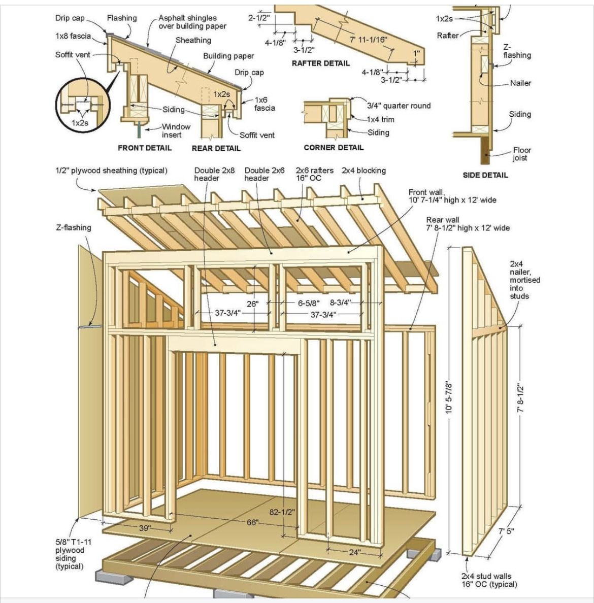 - Robust Framing: The plan calls for solid 2×4 framing spaced 16 inches on center, a standard for strength and rigidity. The inclusion of a Double 2×8 Header over the wide front opening is a professional detail that ensures the wall can support the roof’s weight without sagging.