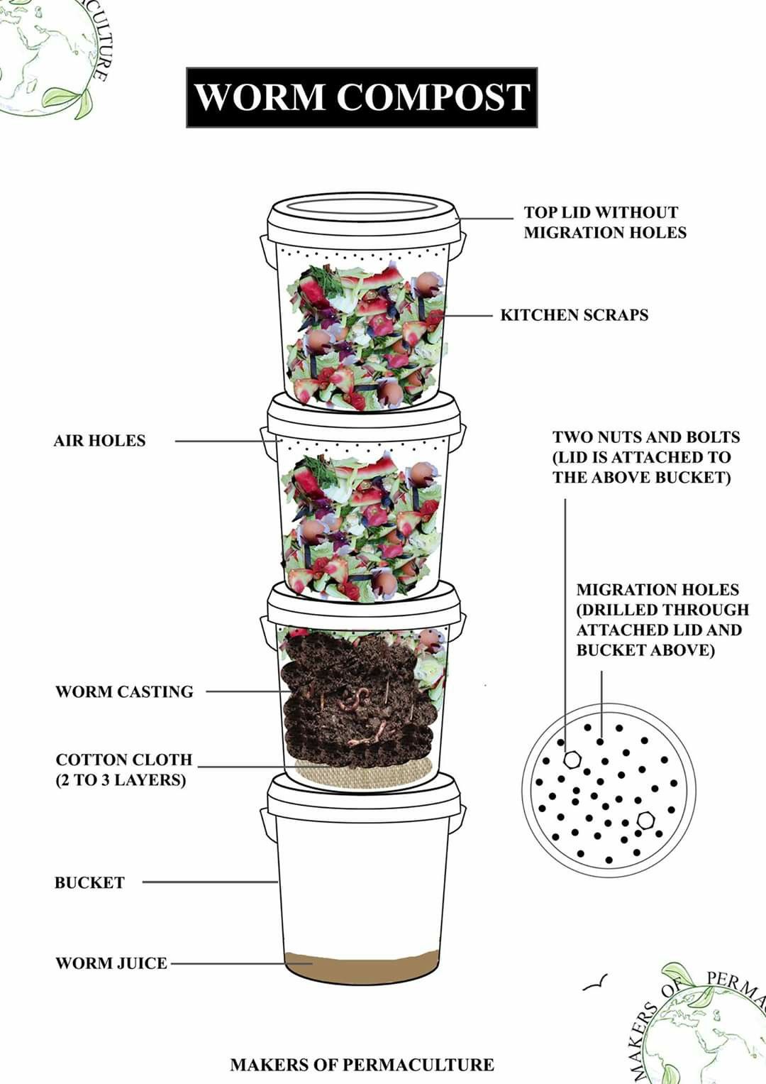- Migration holes drilled between buckets allow worms to move upward when food in one layer is finished, leaving behind worm castings.