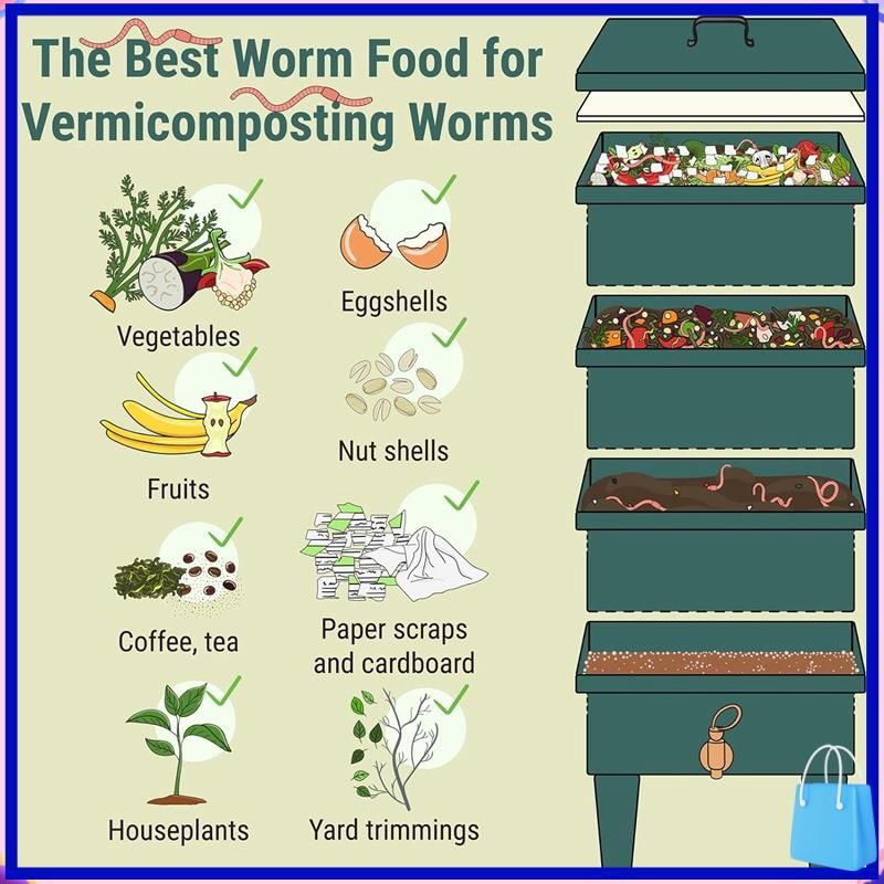 The image highlights the best worm-friendly foods for a healthy vermicomposting system. Worms thrive on organic waste, breaking it down into nutrient-rich compost known as vermicast, often called “black gold” by gardeners.
