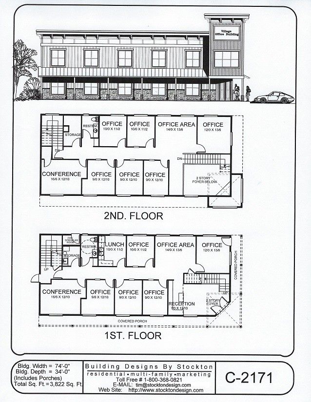 A fresh set of plans is making the rounds in local development circles this week: Plan C-2171, a compact, two-story office building by Building Designs by Stockton. The drawing shows a crisp street façade with a corner tower sign (“Village Office Building”), long porch shading the ground-floor windows, and a second-story band of offices above. It’s the kind of small-business hub you’d expect at the edge of a town center—polished enough for clients, practical enough for day-to-day work.